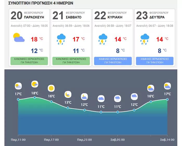 • Κυριακή 22/02: Συννεφιασμένος θα είναι ο καιρός καθ’ όλη τη διάρκεια της ημέρας, με βροχές κατά περιόδους και ενίσχυση των ανέμων.
