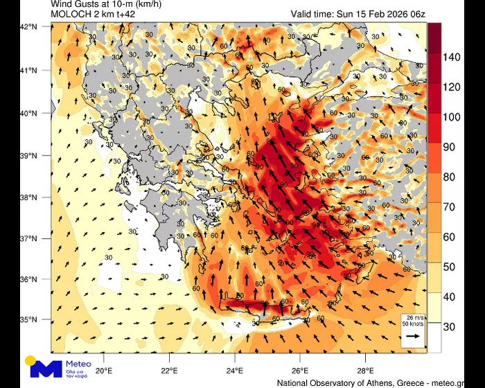 Σημειώνεται ότι οι ριπές του ανέμου αναμένεται να ισχυρές ακόμα και στη στεριά με έμφαση στη Κρήτη και στα υπόλοιπα νησιωτικά τμήματα του Αιγαίου όπως διακρίνεται και στην παρακάτω ομάδα χαρτών για τις πρωινές και μεσημβρινές ώρες της Κυριακής 15/02.