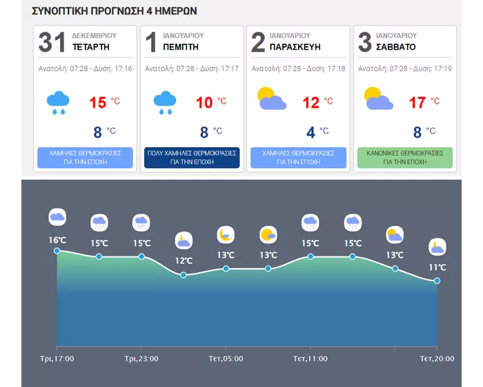 – Από τις πρώτες πρωινές ώρες της Τετάρτης 31/12 και από τα βόρεια αναμένεται πτώση της θερμοκρασίας της τάξης των 7-10 βαθμών Κελσίου σε σχέση με τις θερμοκρασίες της Τρίτης 30/12 η οποία θα γίνει αισθητή κυρίως στα κεντρικά και βόρεια τμήματα της χώρας.