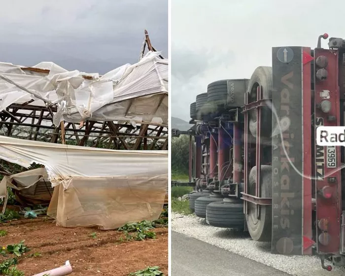Στην περιοχή του Αναδασμού, η ισχύς των ριπών του ανέμου είναι τέτοια που κατάφερε να ανατρέψει μια σταθμευμένη νταλίκα, ένα περιστατικό που καταδεικνύει την επικινδυνότητα της κατάστασης για τους οδηγούς και τους εργαζόμενους στην περιοχή. Σε πολύ κοντινή απόσταση, ένα ξύλινο θερμοκήπιο σε πλήρη παραγωγική διαδικασία ισοπεδώθηκε σχεδόν ολοκληρωτικά, αφήνοντας τους ιδιοκτήτες σε απόγνωση. Η μανία της φύσης δεν σταμάτησε εκεί, καθώς ζημιές αναφέρθηκαν και στις εγκαταστάσεις μιας παλαιάς, εγκαταλελειμμένης βιομηχανικής μονάδας που δεσπόζει στην ευρύτερη περιοχή.