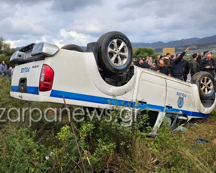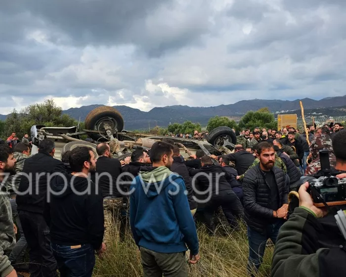 Οι αγρότες στα Χανιά βανδάλισαν και αναποδογύρισαν ένα περιπολικό, ενώ από τα επεισόδια έχουν τραυματιστεί δύο αστυνομικοί. Παράλληλα, ζημιές υπέστη και η κλούβα της αστυνομίας από τον πετροπόλεμο, η οποία απομακρύνθηκε. Οι πέτρες στο οδόστρωμα είναι αμέτρητες, όπως φαίνεται χαρακτηριστικά και από τις παρακάτω φωτογραφίες.