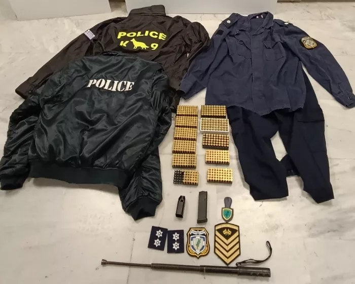 Η σύλληψη έγινε μετά από έρευνα στην οικία του, όπου εντοπίστηκαν και κατασχέθηκαν 531 φυσίγγια διαφόρων διαμετρημάτων, μεταλλική ράβδος, γεμιστήρας πιστολιού, εξάρτημα γεμίσματος γεμιστήρα, καθώς και είδη ενδυμάτων με διακριτικά και σήματα της Ελληνικής Αστυνομίας και του Πολεμικού Ναυτικού.