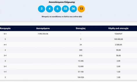 <span dir="auto">Οι τυχεροί αριθμοί της κλήρωσης Τζόκερ (κλήρωση </span><strong><span dir="auto">3009</span></strong><span dir="auto"> ) για το ποσό των </span><strong><span dir="auto">7.993.934,96 ευρώ</span></strong><span dir="auto"> είναι: </span><strong><span dir="auto">3, 4, 6, 33, 36</span></strong><span dir="auto"> και Τζόκερ ο αριθμός </span><strong><span dir="auto">13</span></strong><span dir="auto"> </span> <img class="alignnone size-full wp-image-27876" src="https://2810.gr/wp-content/uploads/2026/01/8881047-1.webp" alt="" width="472" height="282" />