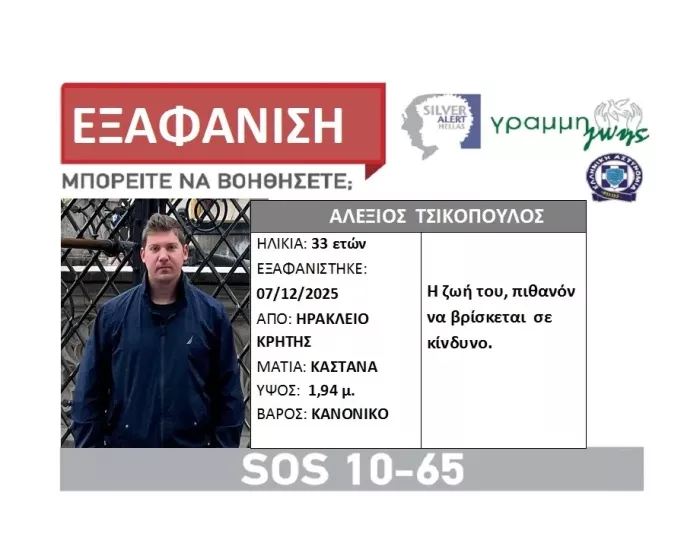 Εξελίξεις στην υπόθεση της εξαφάνισης του Αλέξη Τσικόπουλου, του 33χρονου γιατρού που αγνοείται εδώ και 10 μέρες από το Ηράκλειο και λίγες μέρες μετά εντοπίστηκε στα Χανιά το αυτοκίνητό του.